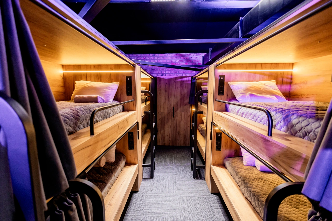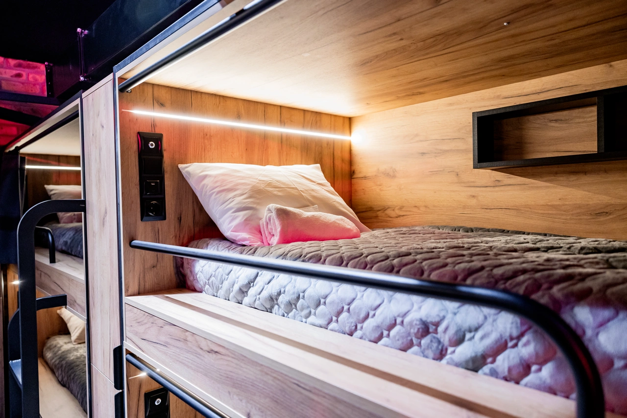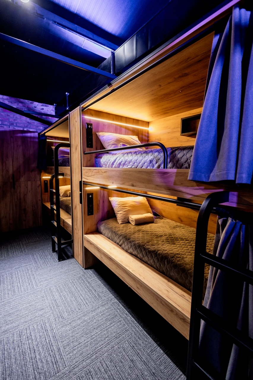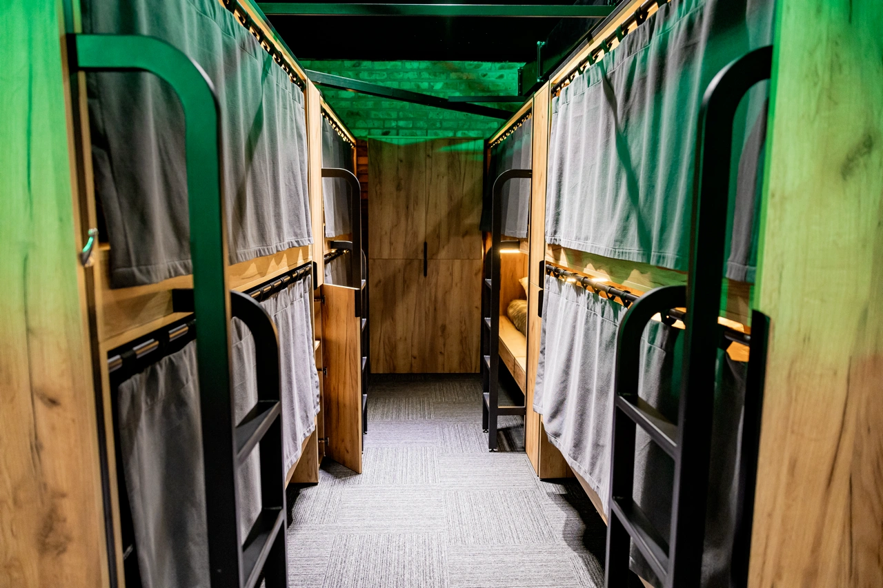 Завдяки спальним капсулам ви маєте змогу балансувати між особистим простором та загальним проживанням. Для вашого комфорту капсульні зони мають спальне місце, шафу для зберігання речей. Приміщення обладнане вентиляцією та кондиціонерами.
